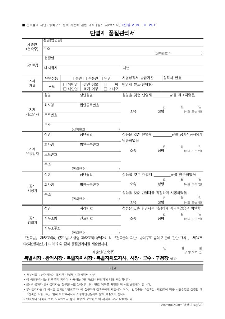 단열재 품질관리서 양식 서식(건축물의 피난ㆍ방화구조 등의 기준에 관한 규칙)