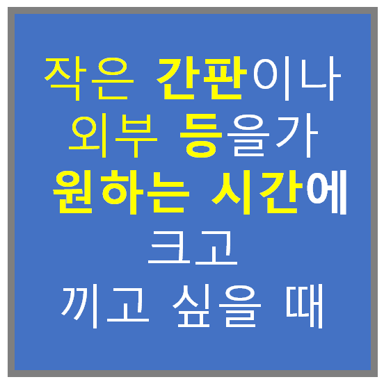 인테리어를 하다보면 간판등이나 외부등의 키고 끄는 시간을 설정하는 데 어려움이 있었습니다. 간판등의 경우 영업이 끝나도 더 켜 놓고 싶고 아주 늦은 밤에는 꺼놓고 싶은 마음이 들때가 많습니다. 그리고 외부등의 경우 좀 유동적으로 키고 끄고 싶은 생각이 듭니다. 그래서 저는 원격으로 이를 사용할 수 있게 세팅을 해둡니다.